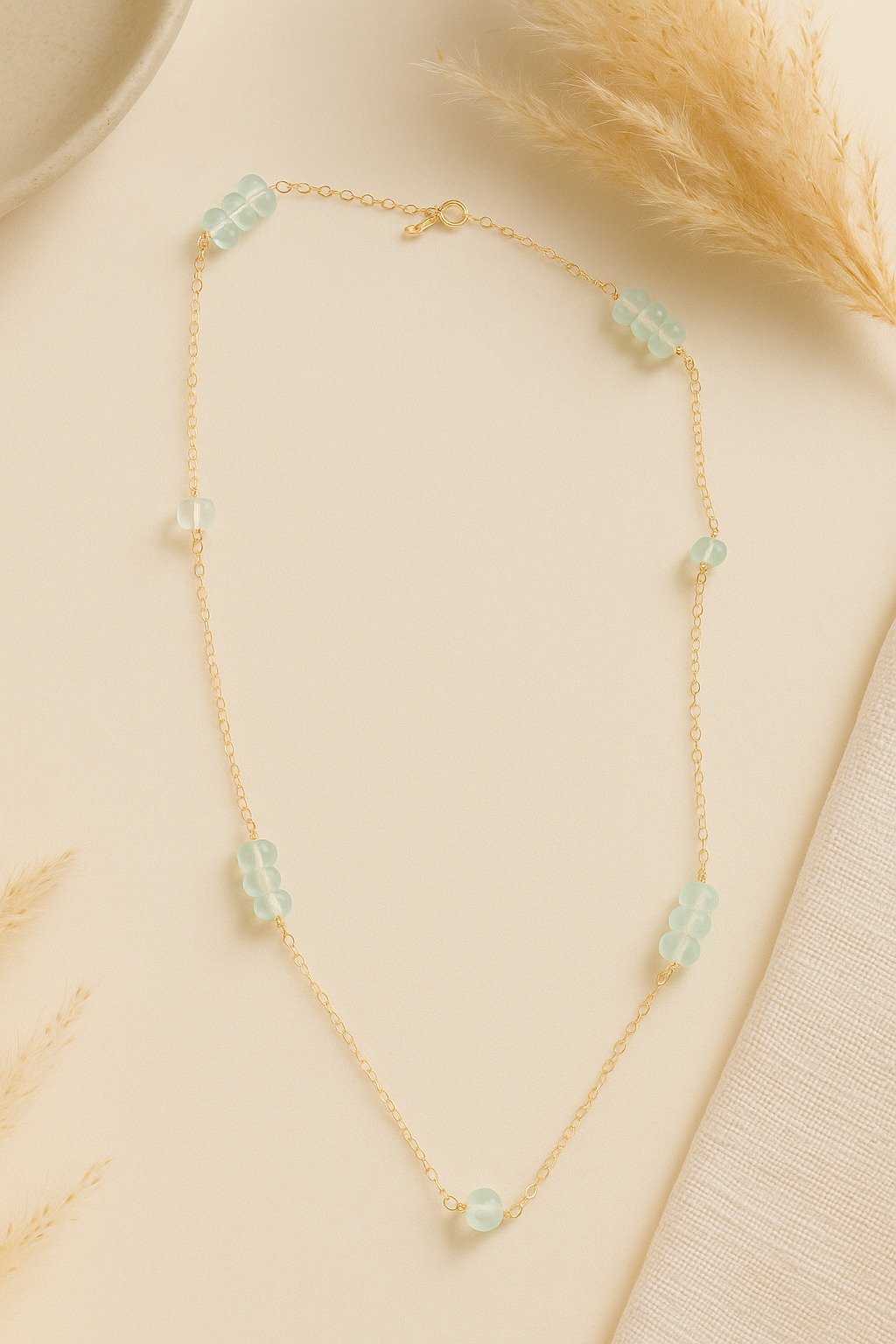 This delicate handmade necklace has aquamarine stones throughout the 14 kt gold fill necklace to show the beauty of it on your neck. It will become one of your favourite piece to showcase with your everyday style